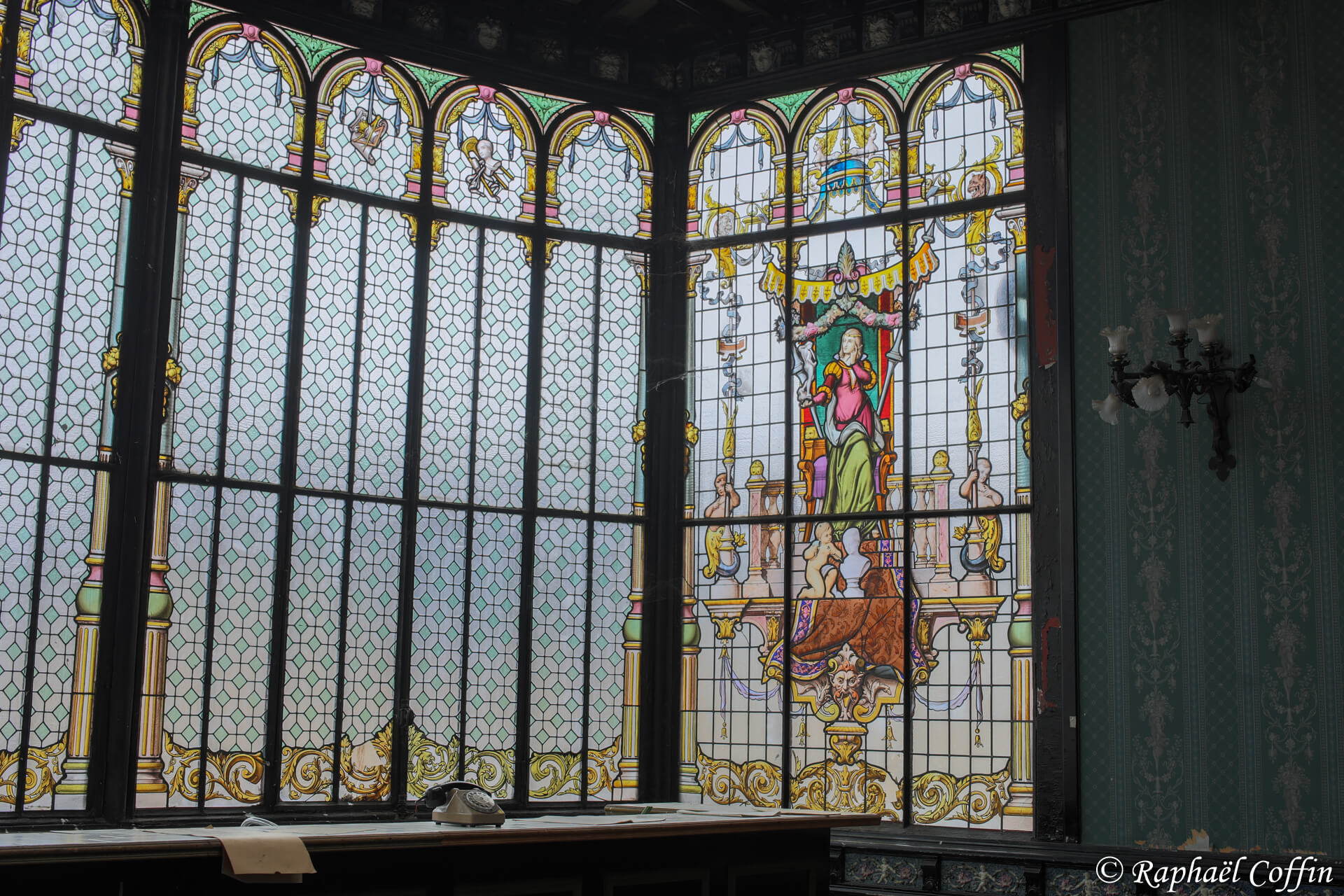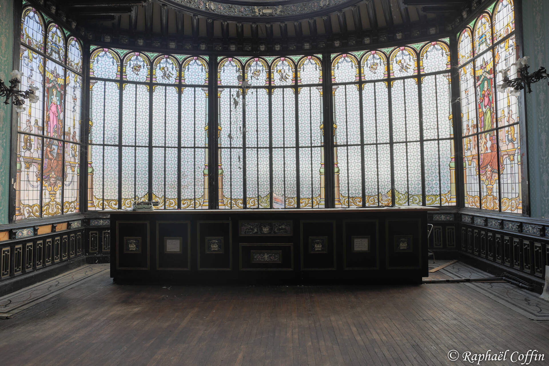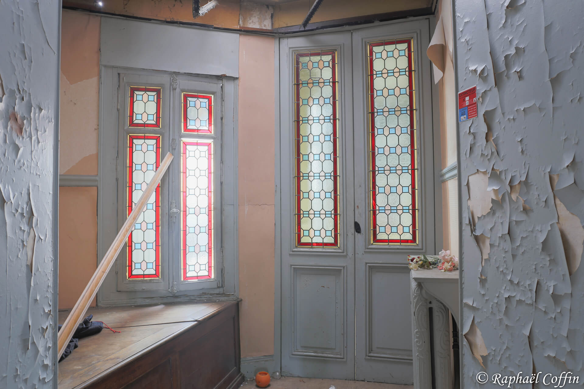 Cet ancien immeuble de 3 étages est implanté au centre d’une ville historique. Construit entre 1875 et 1889, ce lieu est une ancienne loge de Franc-Maçon. L’état général est vraiment catastrophique, des cheminées tombent, beaucoup de vitres sont casées et de nombreux objets ont été volés. A l’époque le lieu devait être très luxueux quand on voit la taille des miroirs et le marbre un peu partout. Abandonné depuis un peu plus de 10 ans, il est aujourd’hui « squatté » avec l’accord du propriétaire. La pièce qui a le plus de cachet est une magnifique verrière relativement en bon état, située dans un salon de style Louis XV et Louis XVI.