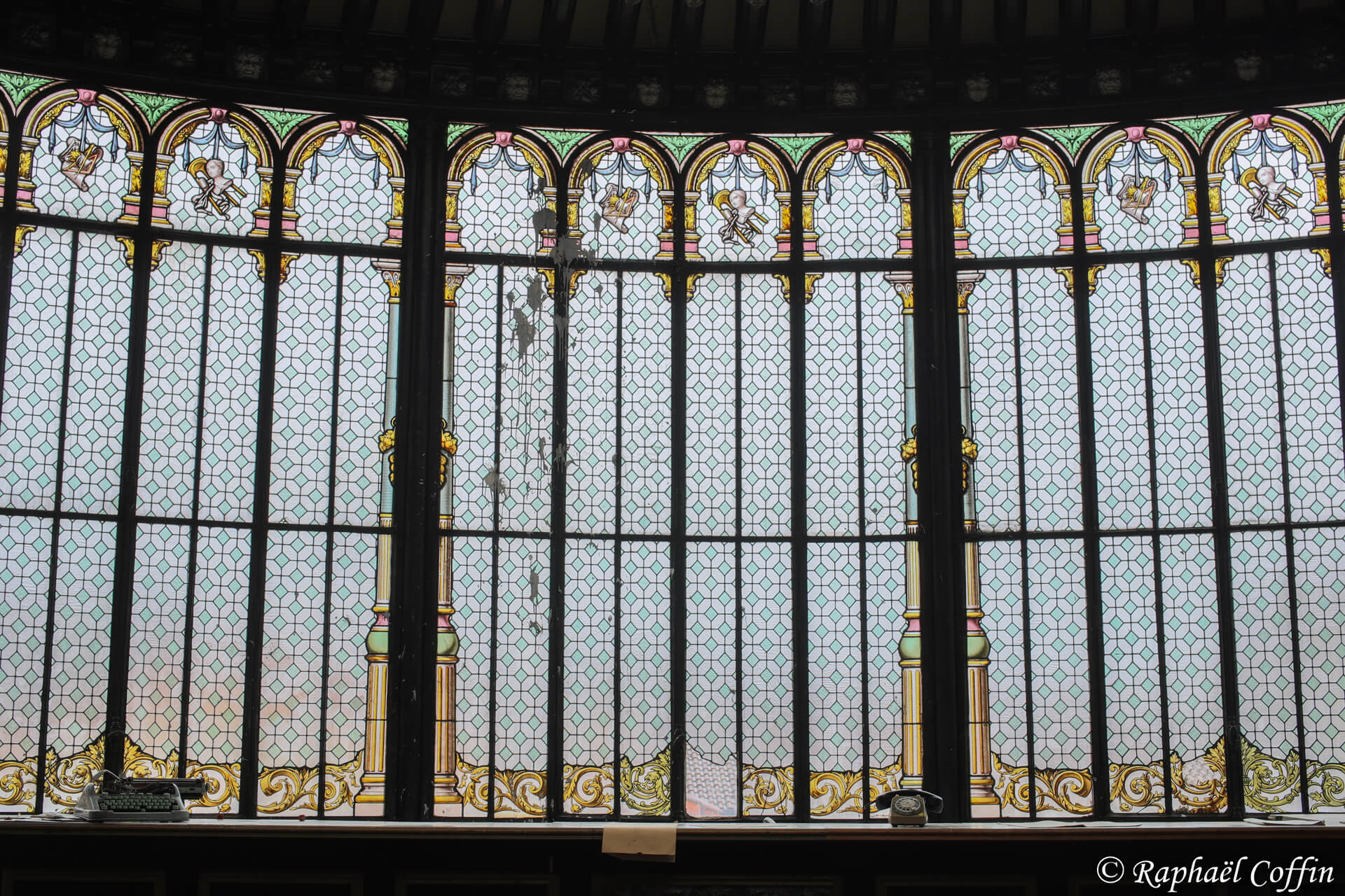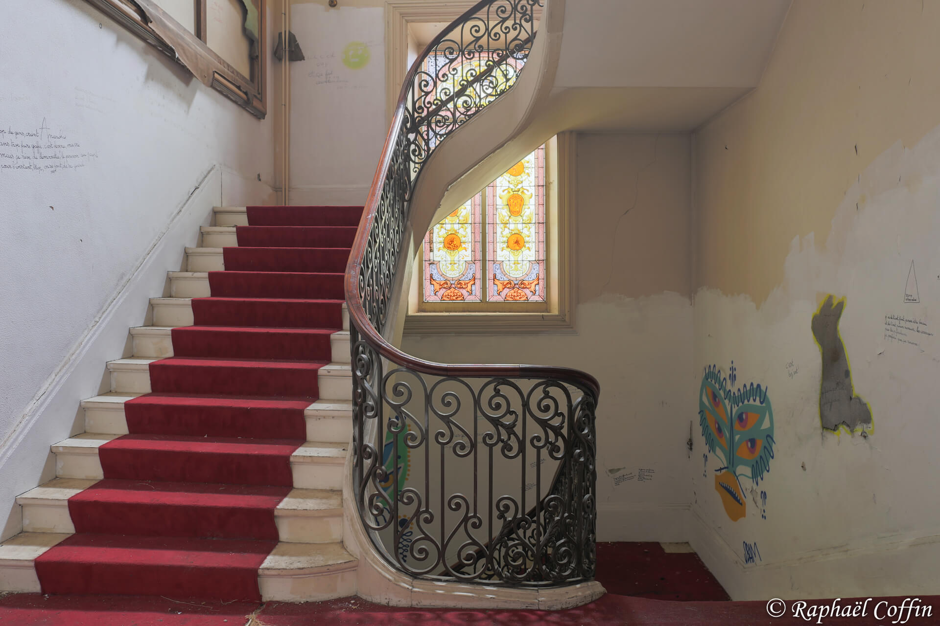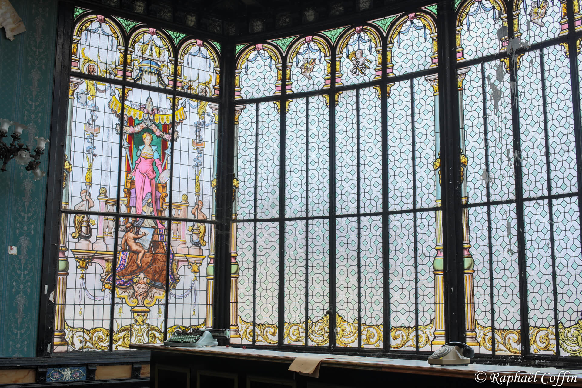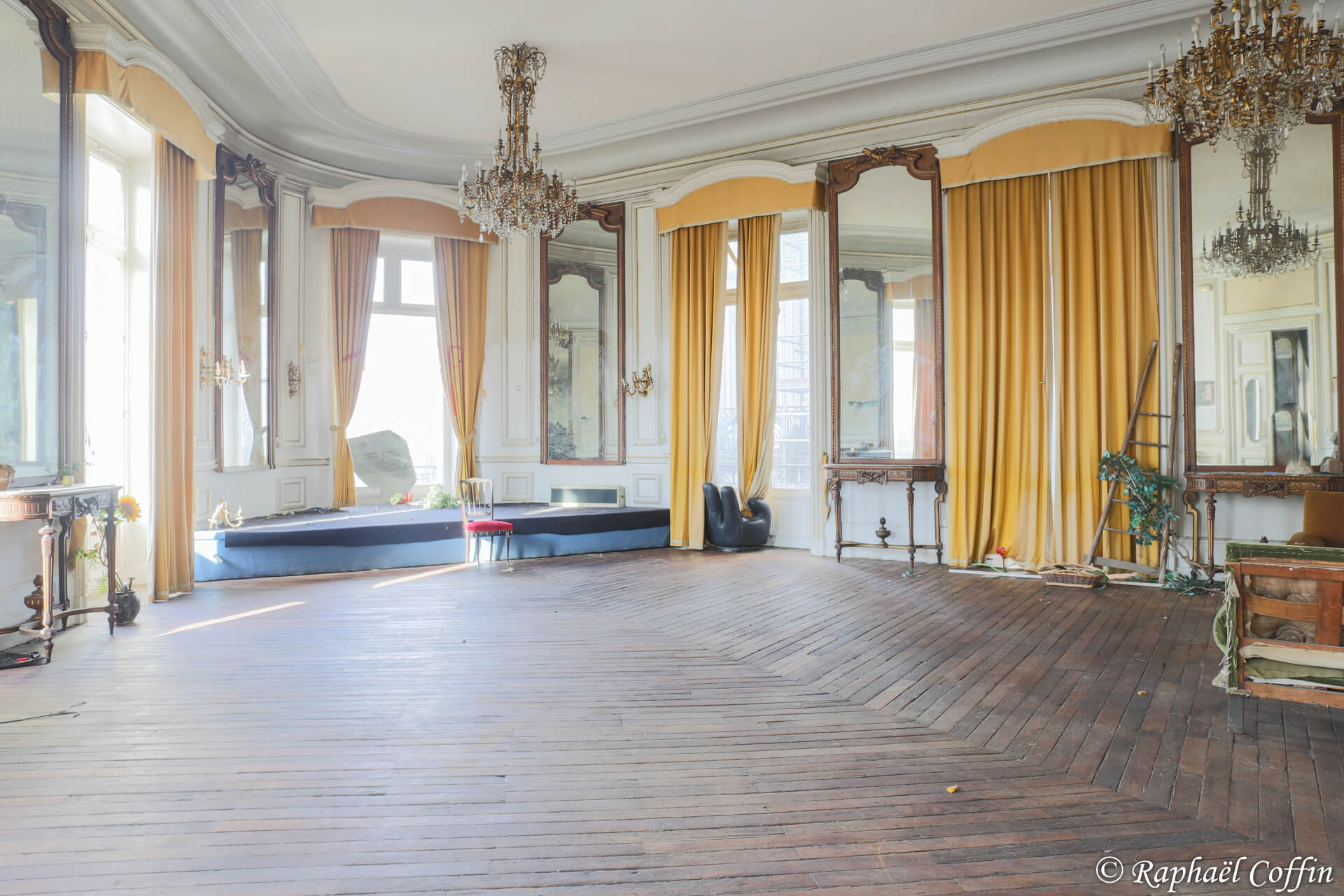 Cet ancien immeuble de 3 étages est implanté au centre d’une ville historique. Construit entre 1875 et 1889, ce lieu est une ancienne loge de Franc-Maçon. L’état général est vraiment catastrophique, des cheminées tombent, beaucoup de vitres sont casées et de nombreux objets ont été volés. A l’époque le lieu devait être très luxueux quand on voit la taille des miroirs et le marbre un peu partout. Abandonné depuis un peu plus de 10 ans, il est aujourd’hui « squatté » avec l’accord du propriétaire. La pièce qui a le plus de cachet est une magnifique verrière relativement en bon état, située dans un salon de style Louis XV et Louis XVI.